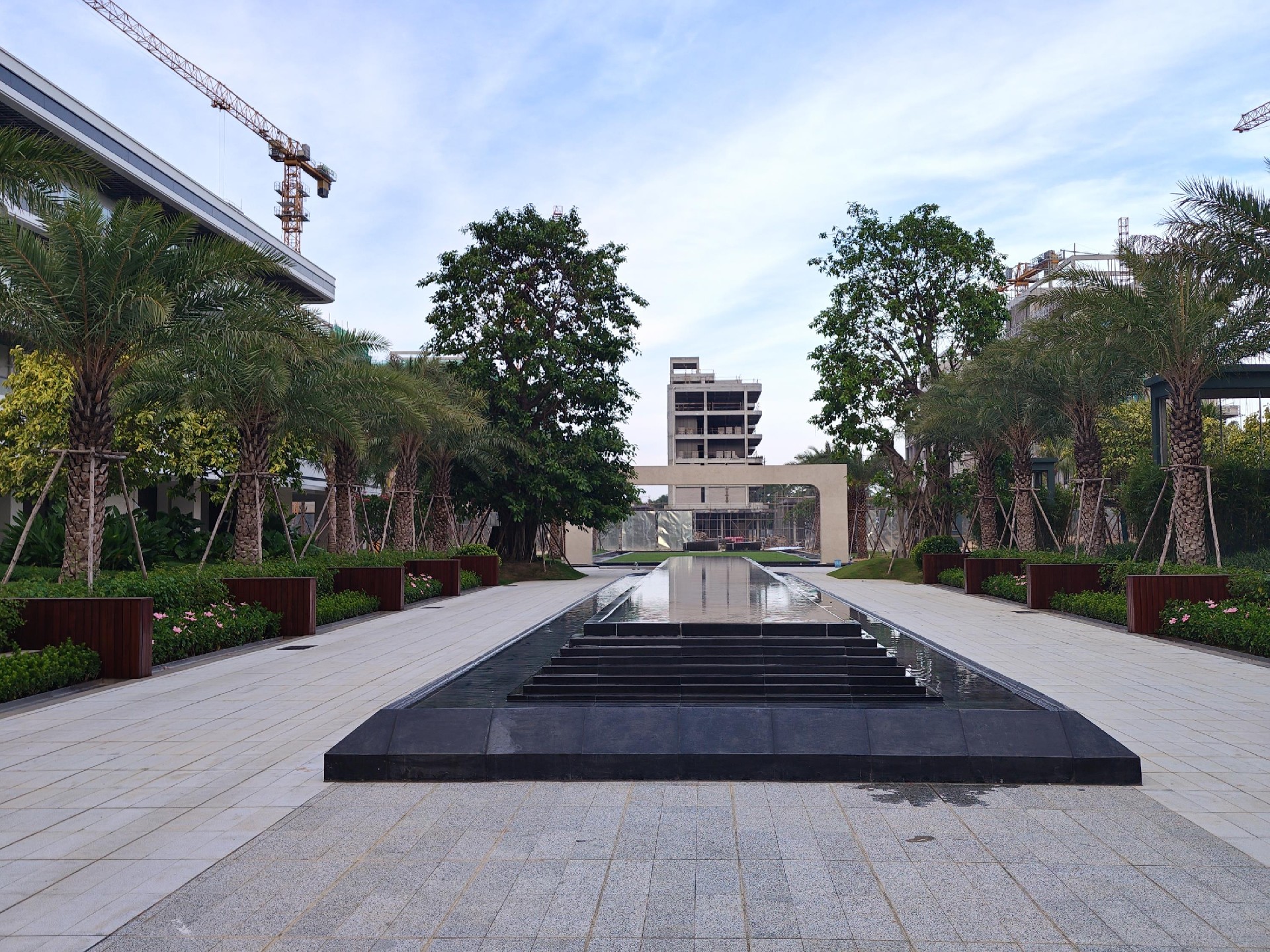 经由一连奋战,项目展示区已起源泛起效果。条理富厚的植被、镜面水景与现代修建相映成趣。与此同时,中轴区域作为整个项目的景观焦点,正在加速推进地形塑造、大型乔木栽植及硬景施工,预计将于近期完成主体框架。