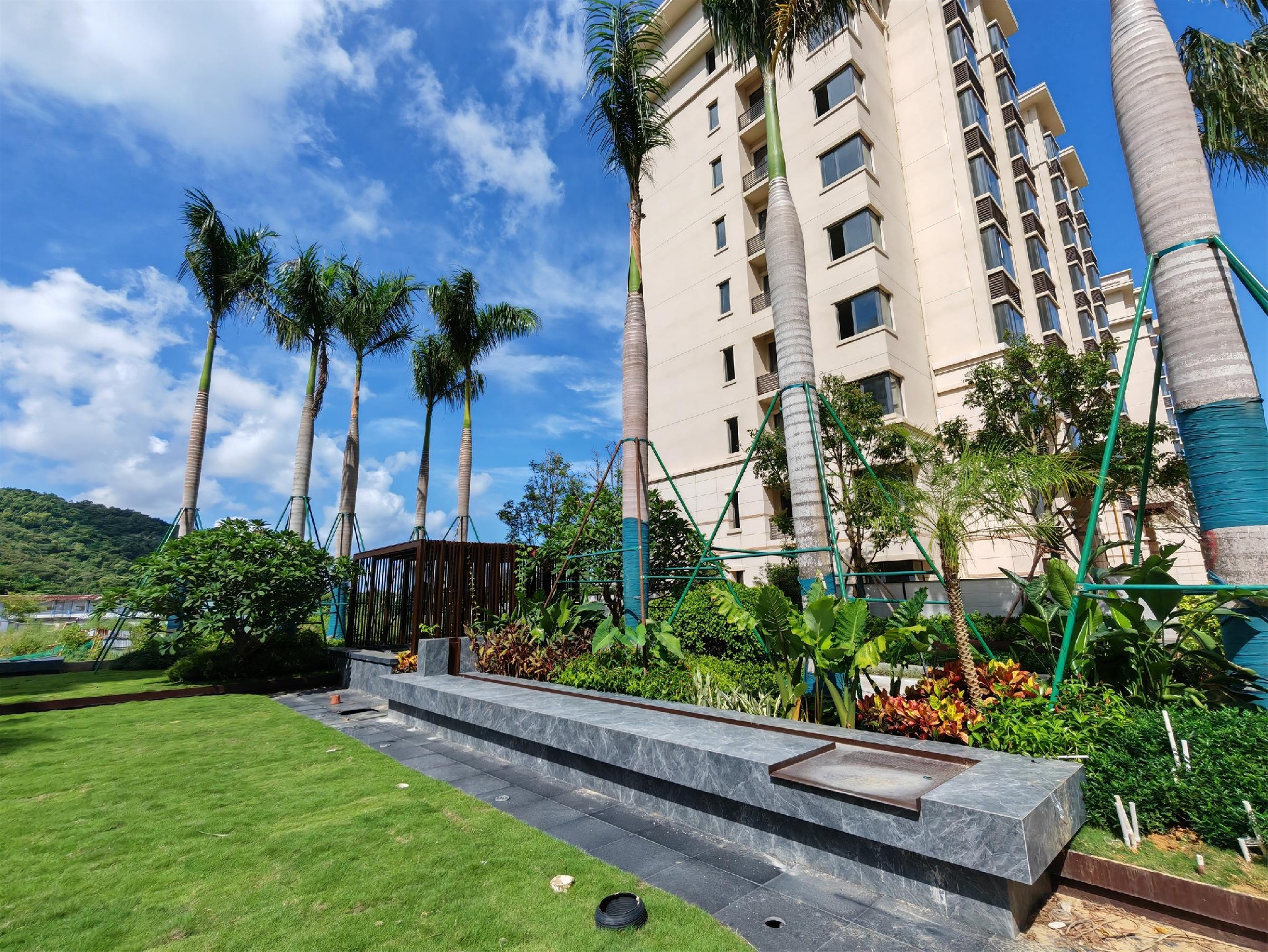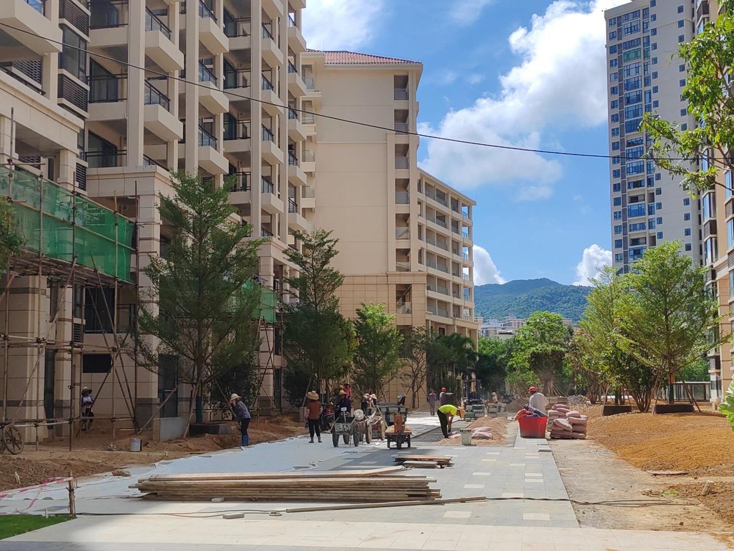 工人们顶着烈日精准施工,黝黑的皮肤、湿透的工装成为他们的"标配"。在景观施工区,园艺师们仔细栽植每一株苗木,确保成活率和景观效果。"再热也要把活干漂亮!"